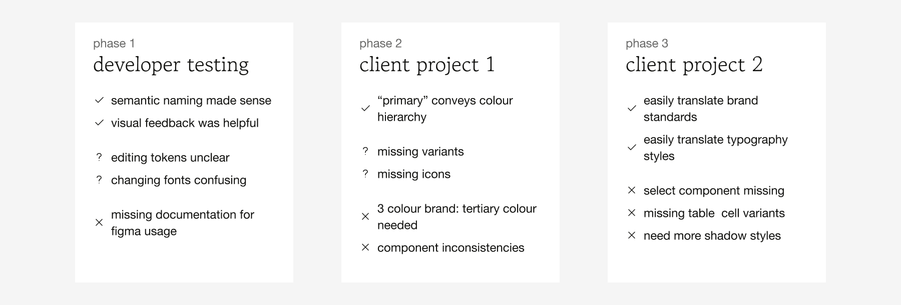 Applying the system to two client projects revealed missing components, the need for a tertiary colour, and more shadows. They validated our implementation of set typography styles, which allowed us to easily translate clients brand standards and reduce decision fatigue.